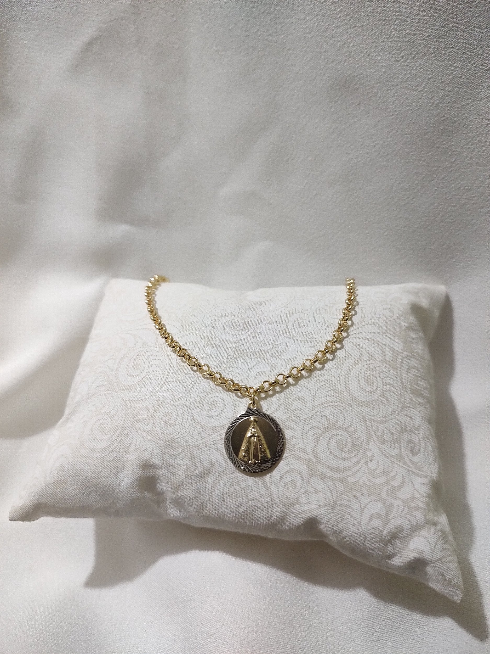 Pulseira cheia de simbolismo religioso, com a medalha da Nossa Senhora Aparecida - ao redor folhado em ródio com detalhes e a imagem em ouro em alto-relevo. Pulseira em malha portuguesa, folheada em ouro e com banho de antialérgico.